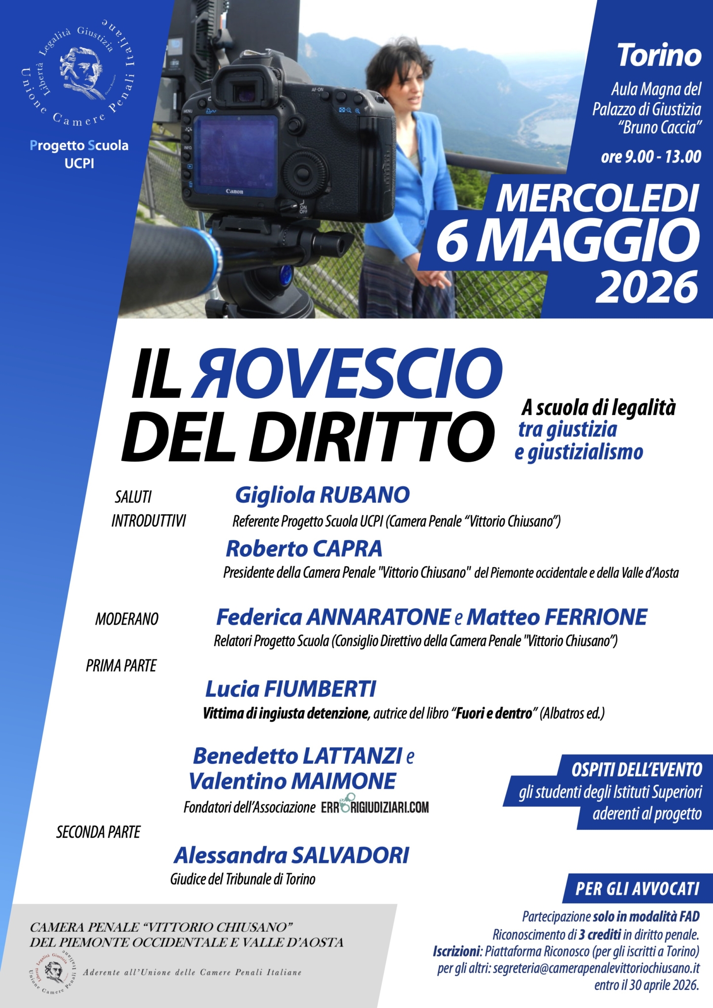 Iscrizioni: piattaforma Riconosco (per gli iscritti a Torino); per gli altri: segreteria@camerapenalevittoriochiusano.it entro il 30 aprile 2026.